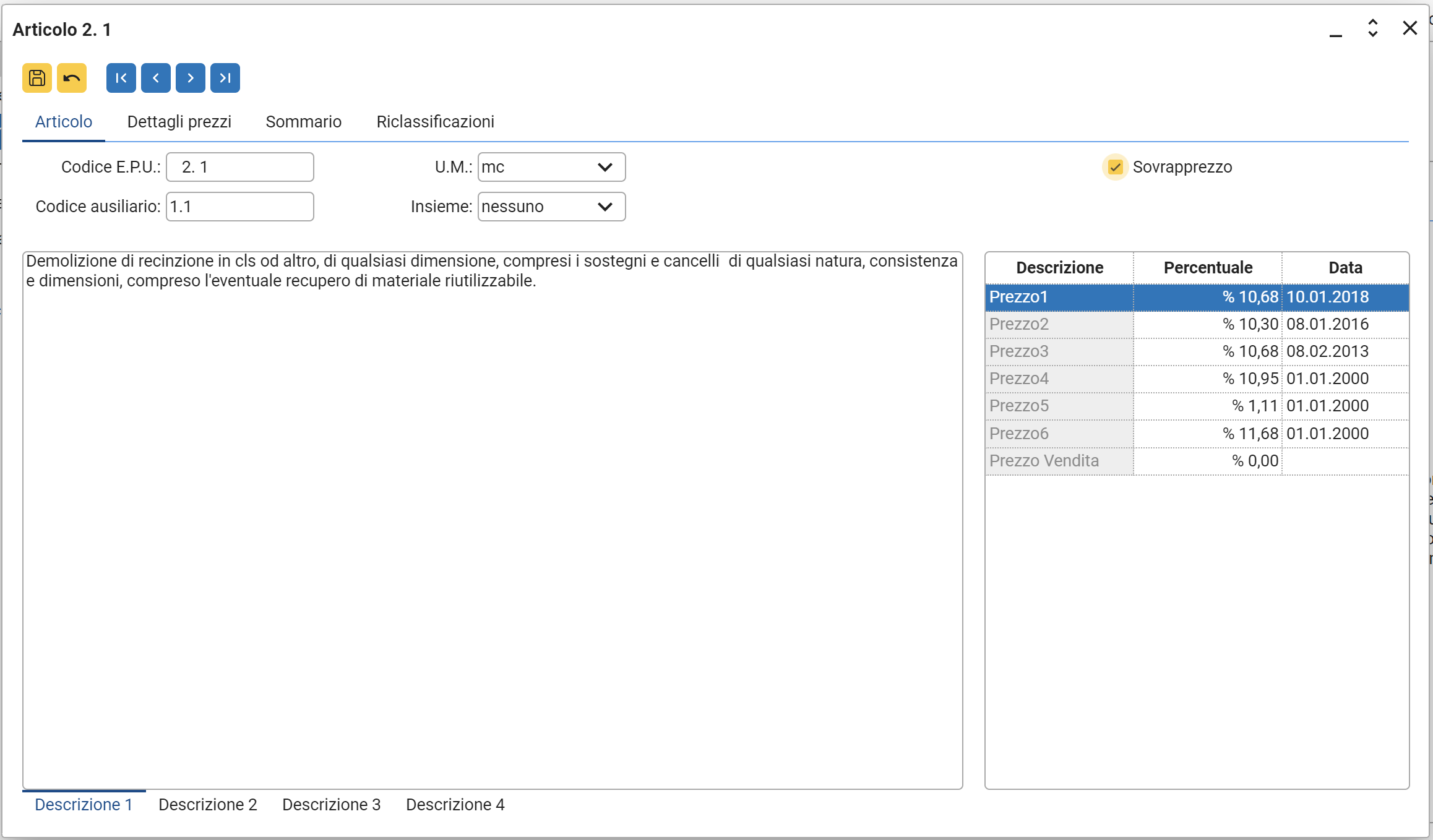 L'articolo Sovrapprezzo serve per gestire voci che non hanno prezzo unitario, non hanno unità di misura e si esprime in percentuale su lavorazioni esistenti.