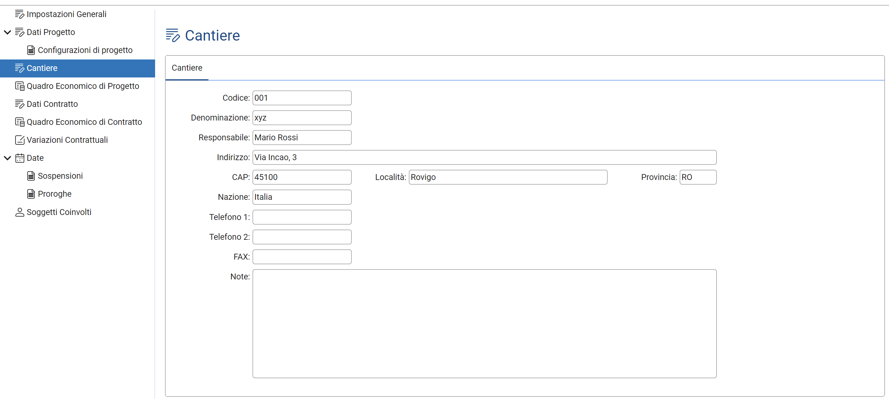 Nella sezione "Cantiere" è possibile inserire dati relativi all'indirizzo del cantiere.