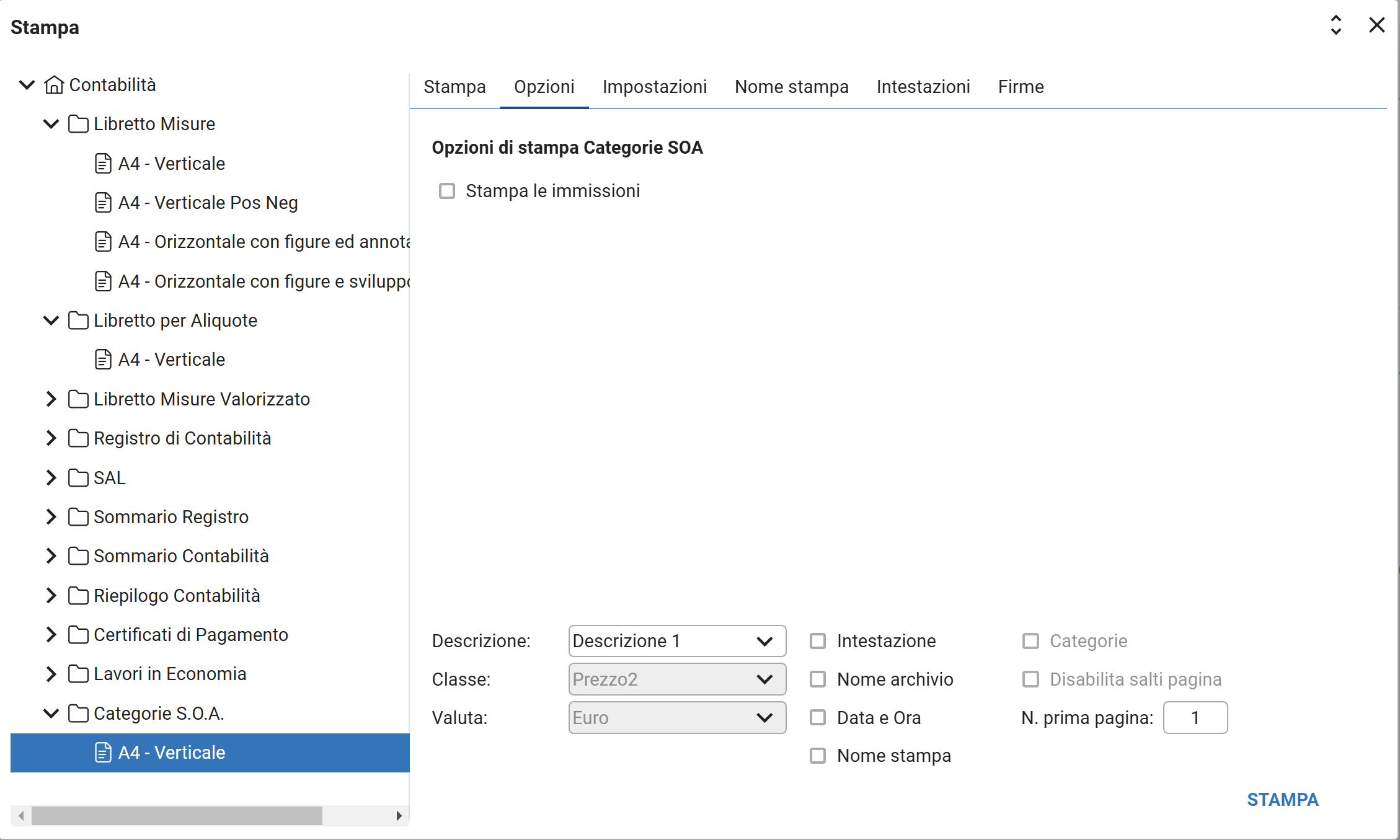 Guida UtenteContabilitàStampe Contabilità Categorie SOA Stampa le immissioni: Se marcato, oltre alle categorie SOA, in stampa compariranno le relative immissioni di contabilità collegate.