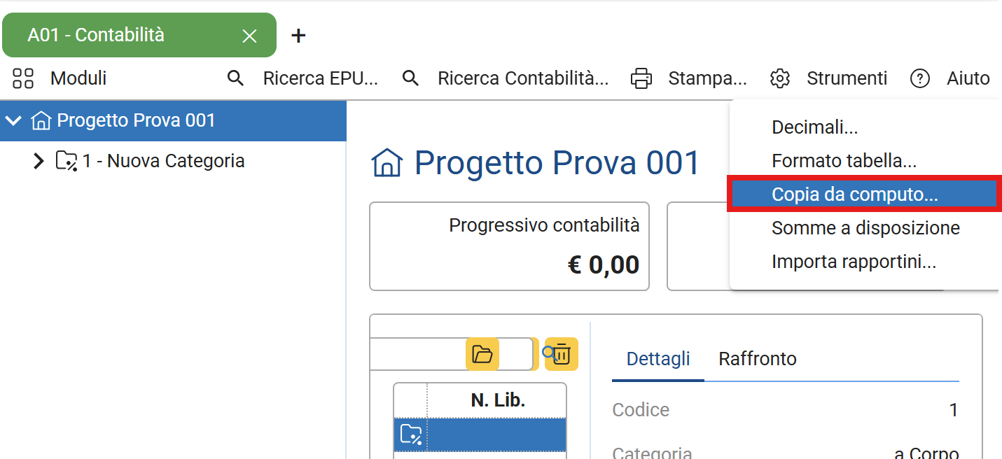 Nel caso il lavoro sia piuttosto semplice e pertanto non si voglia creare manualmente la contabilità, oltre a tutte le metodologie spiegate in questo capitolo per generare le immissioni contabili, esiste una procedura automatica che trasforma tutto il computo metrico in contabilità. Per attivare questa funzione selezionare l'apposito pulsante "Strumenti - "Copia da Computo" presente nella ToolBar in alto a destra.