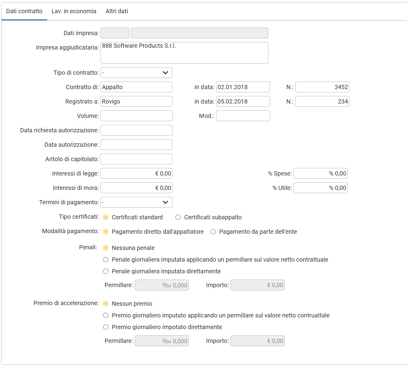 Nella parte bassa della finestra dei Dati di Contratto è possibile inserire, a livello contrattuale, la presenza o meno di penali e premi di accelerazione.