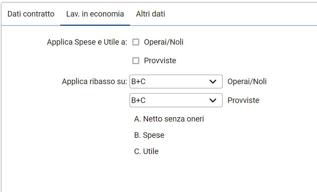 E' possibile preimpostare, come devono essere calcolate le spese e l'utile e dove deve essere calcolato il ribasso inerente le economie inserite nella commessa (Vedi Figura).