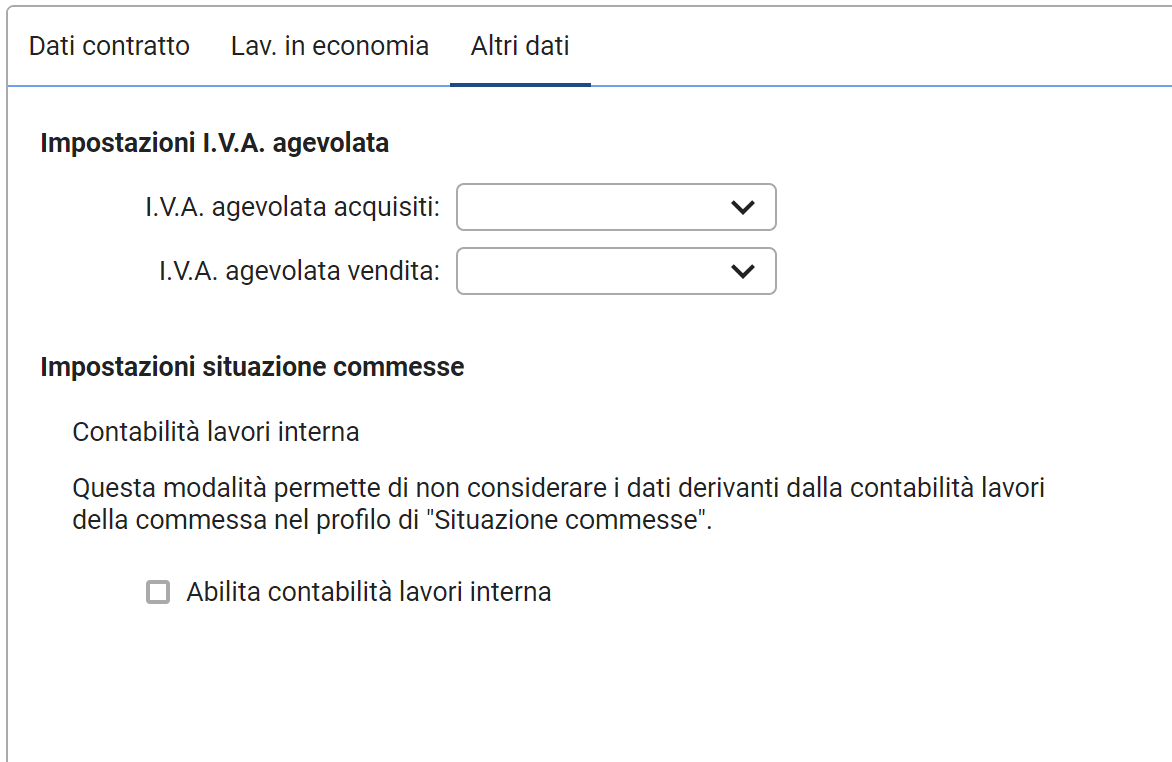 Il flag contenuto in questa sezione ha effetti esclusivamente sul modulo "Situazione commesse". Se spuntato infatti, la contabilità lavori della commessa non verrà considerata in tale modulo.