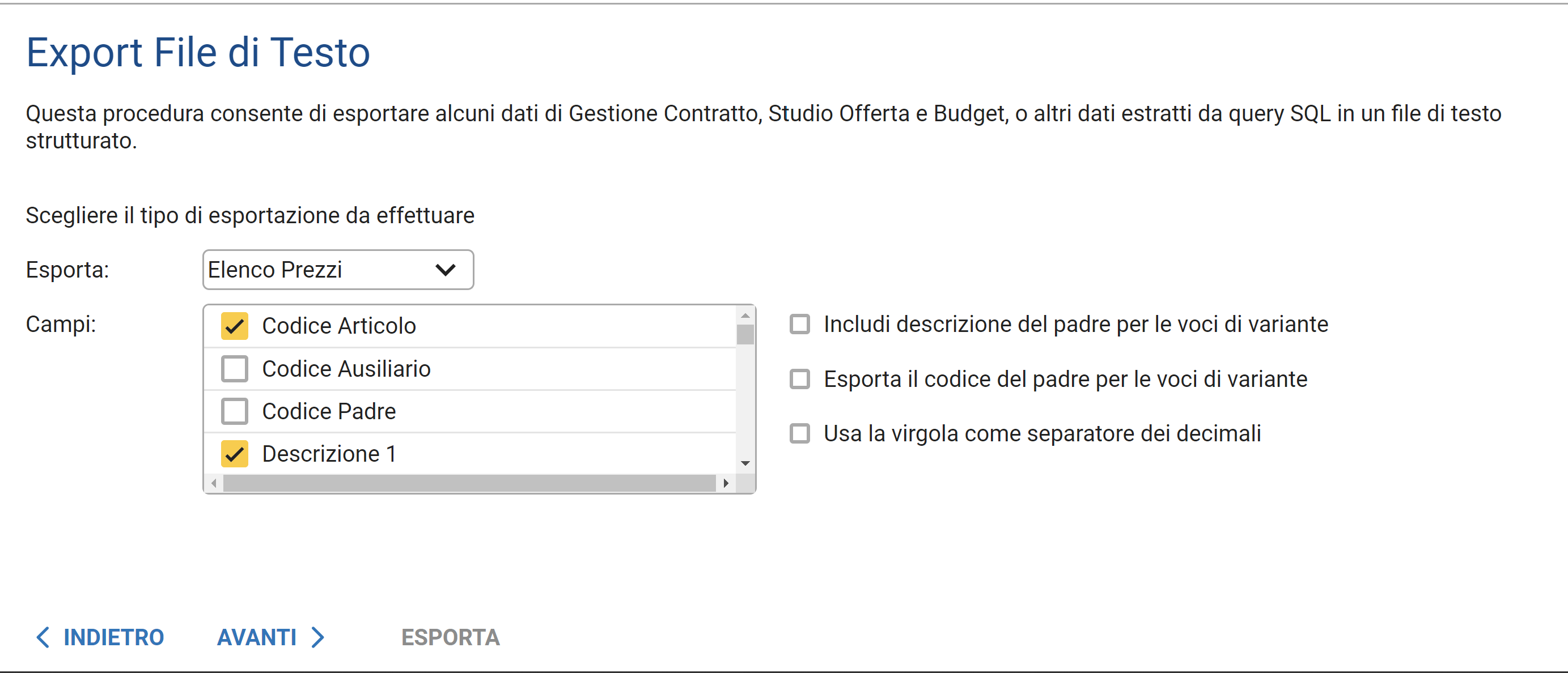 Nella schermata immediatamente successiva alla selezione dell'esportazione in formato File di Testo, impostare le opzioni necessarie e seguire la procedura guidata fino alla fine.