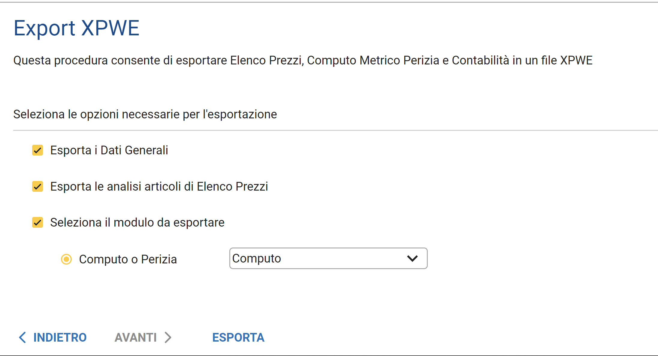 Questa modalità permette di esportare un EPU, Computo o una Contabilità lavori in un file "XPWE".