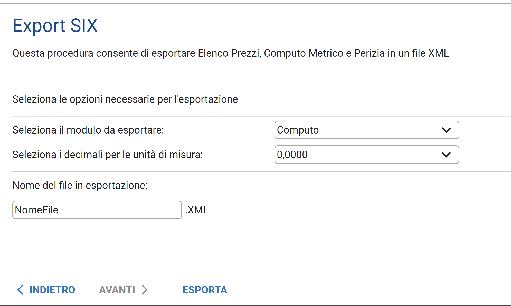 Questa modalità permette di esportare un EPU, Computo o una Perizia lavori in un file "SIX".