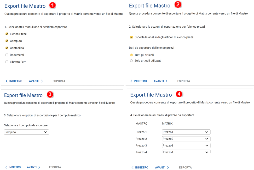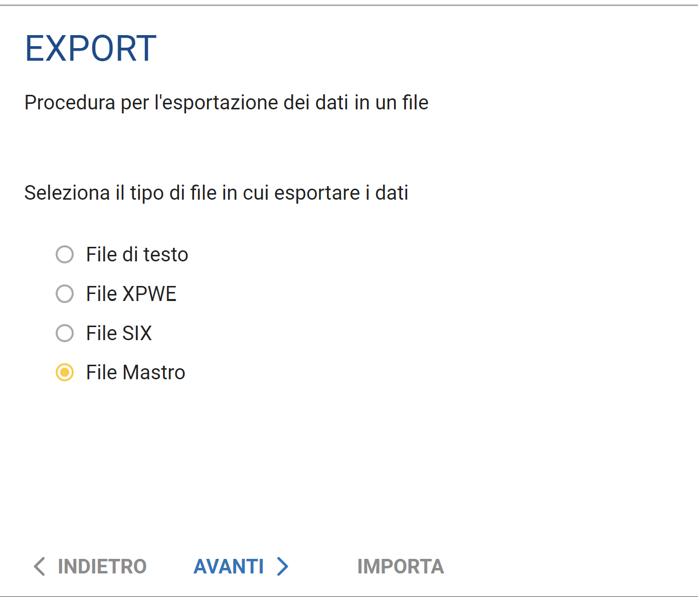 Nella schermata immediatamente successiva alla selezione dell'esportazione in formato Mastro, impostare le opzioni necessarie e seguire la procedura guidata fino alla fine.