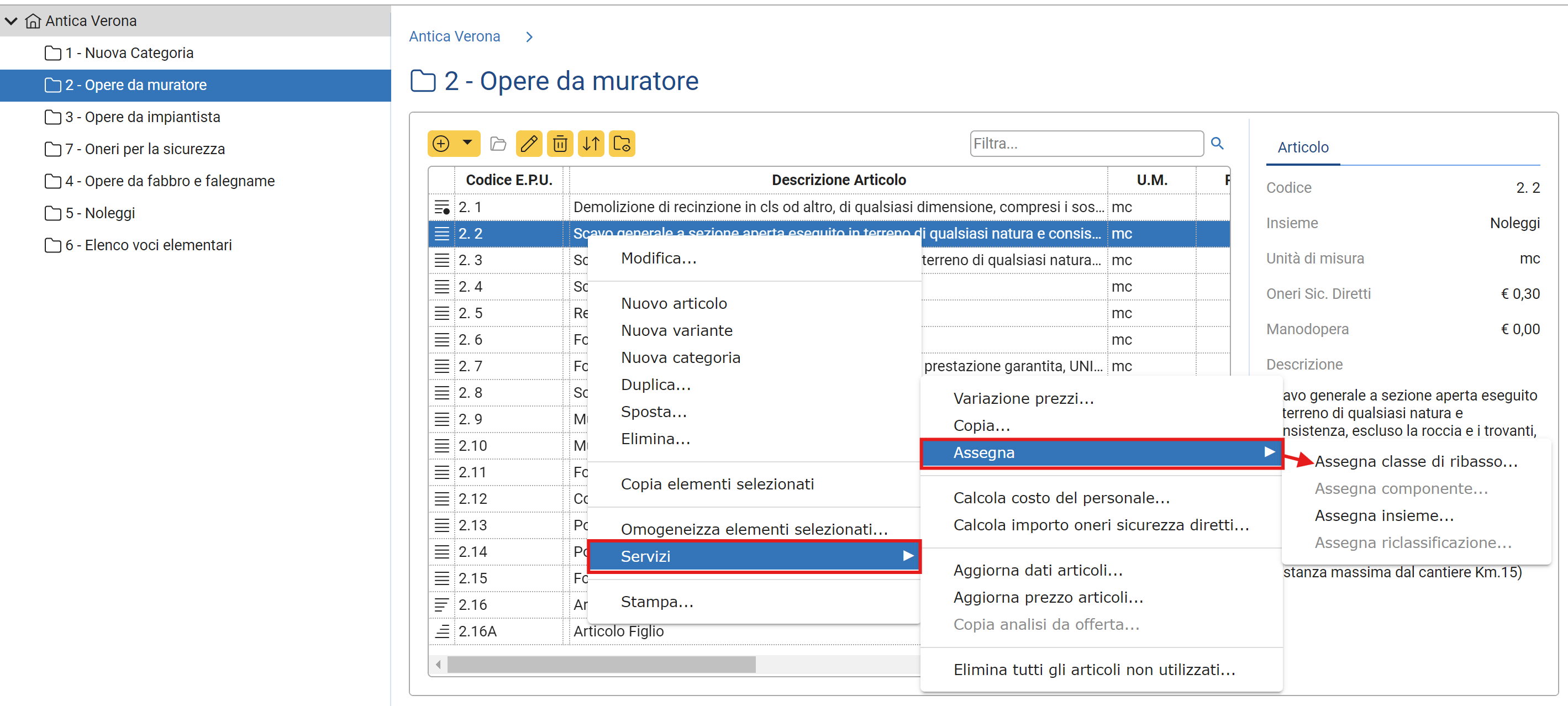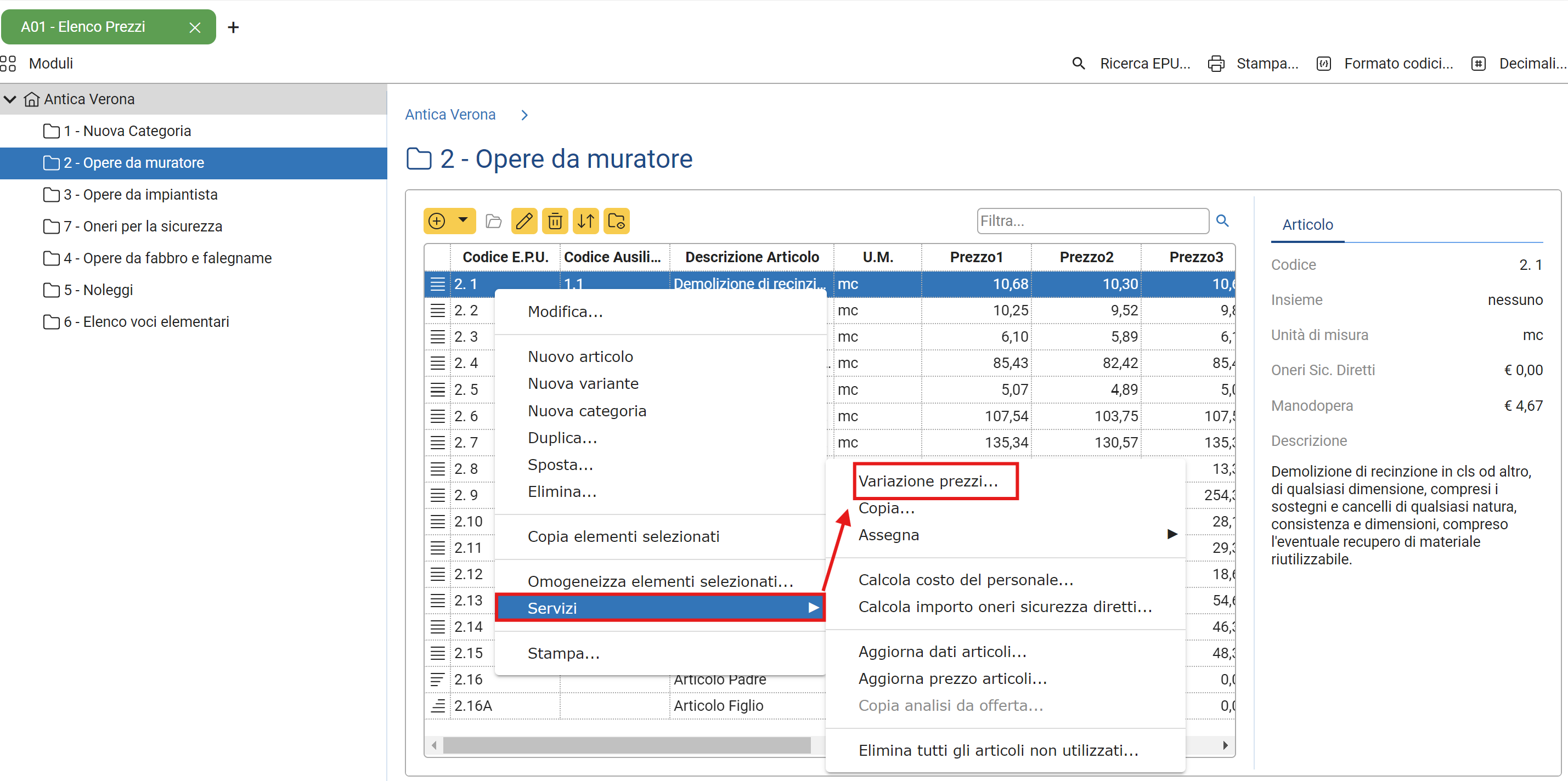 - Attivare il menù contestuale e scegliere l'opzione "Servizi" - "Variazione Prezzi" come rappresentato in figura;