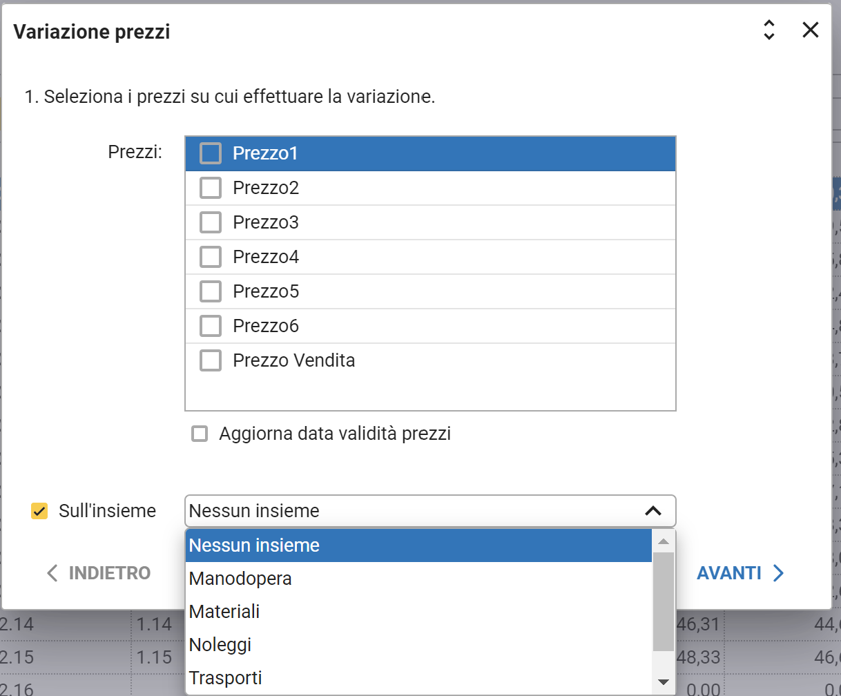 - Nel caso sia necessario effettuare la variazione solo su un'insieme, selezionare l'apposita spunta e scegliere, mediante il menù a discesa l'insieme su cui variare i prezzi;