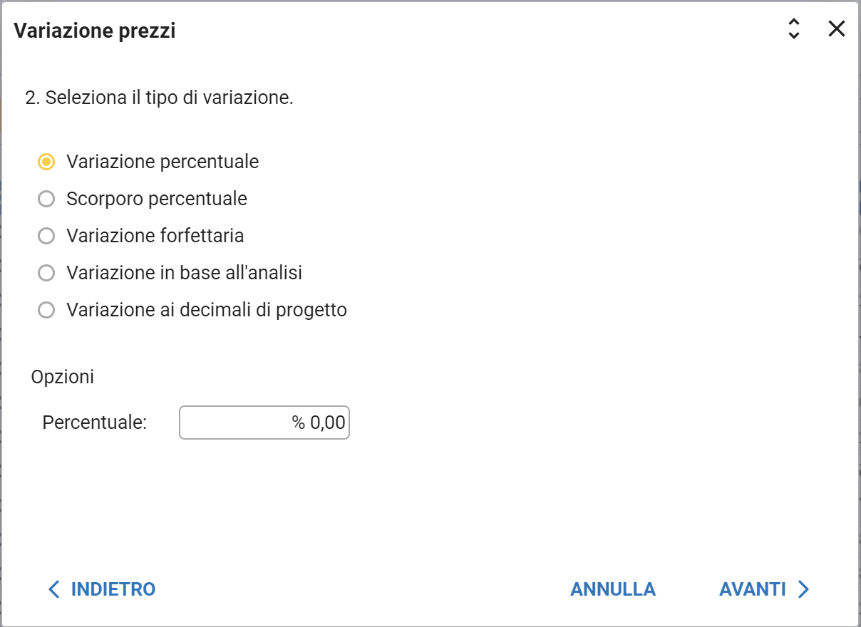 Nella sezione corrente è possibile assegnare in modo massivo agli elementi selezionati una determinata percentuale di oneri per la sicurezza diretti. In caso sia stata fatta l'analisi, è possibile ricalcolare gli oneri della sicurezza diretti o in base alla percentuale già inserita oppure in base all'analisi della sicurezza.