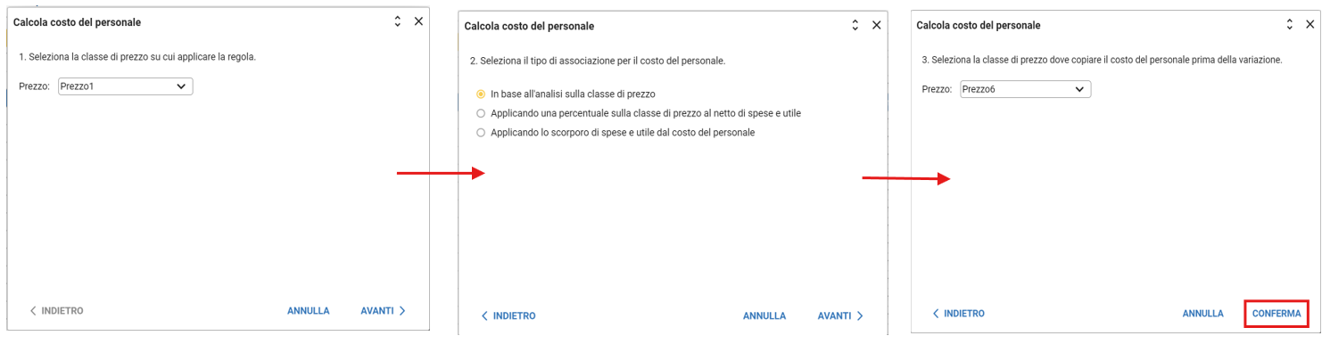 Possiamo scegliere al punto 1 la classe di prezzo alla quale vogliamo applicare la regola per il calcolo del costo del personale.