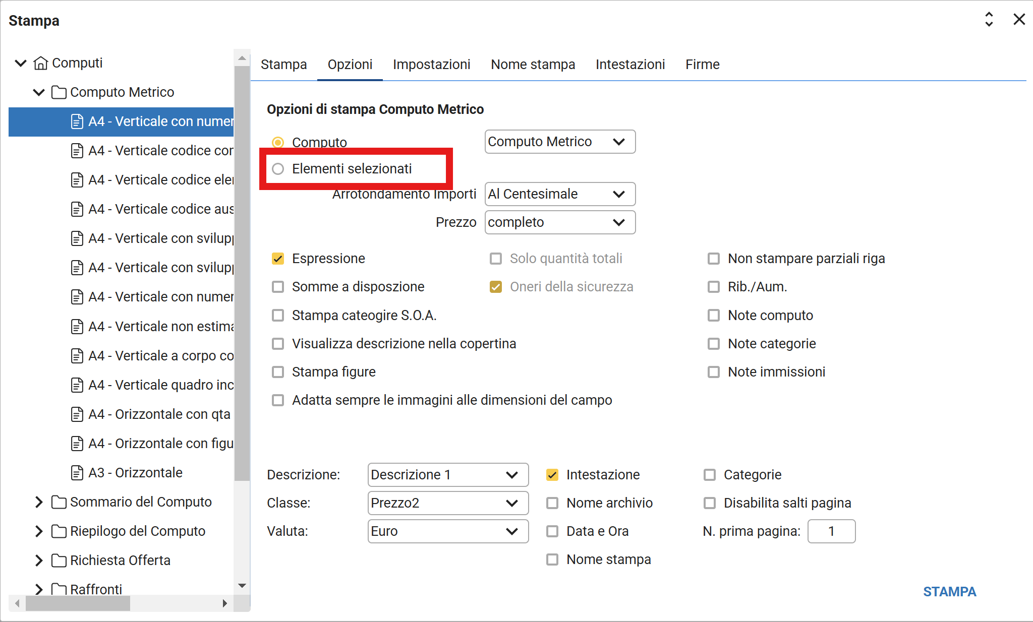 Tale funzione la si può trovare tra le opzioni nella finestra di stampa e permette di stampare solo gli elementi selezionati nell'area centrale della sezione "computi".