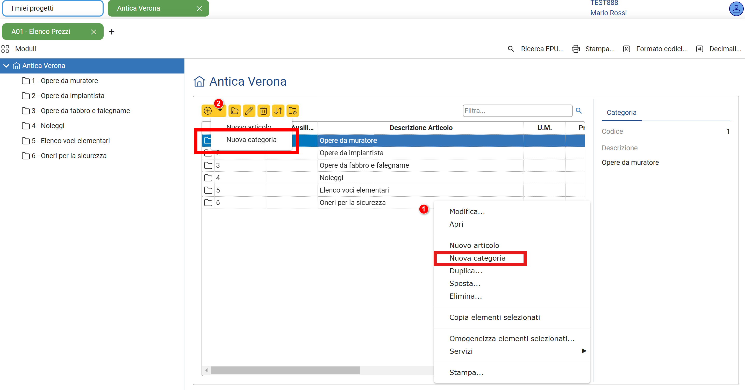 Per creare le categorie è necessario utilizzare il menù contestuale attivabile mediante tasto destro (1) oppure l'apposito pulsante nella toolbar (2) come mostrato in figura .