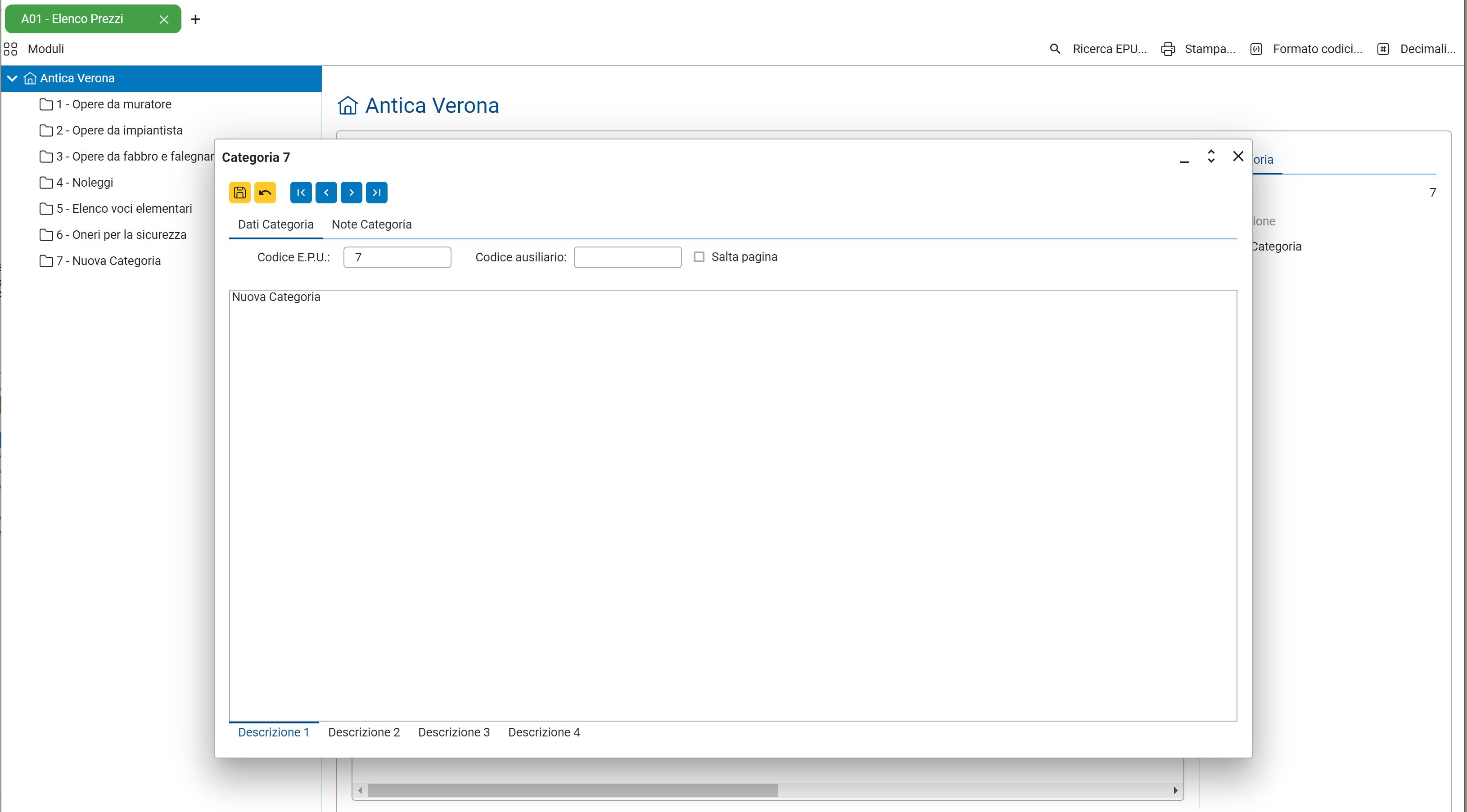 La procedura Crea una nuova categoria consente di creare una nuova categoria nella categoria corrente ('Antica Verona' nella figura di esempio) e apre la scheda per inserire il dettaglio.