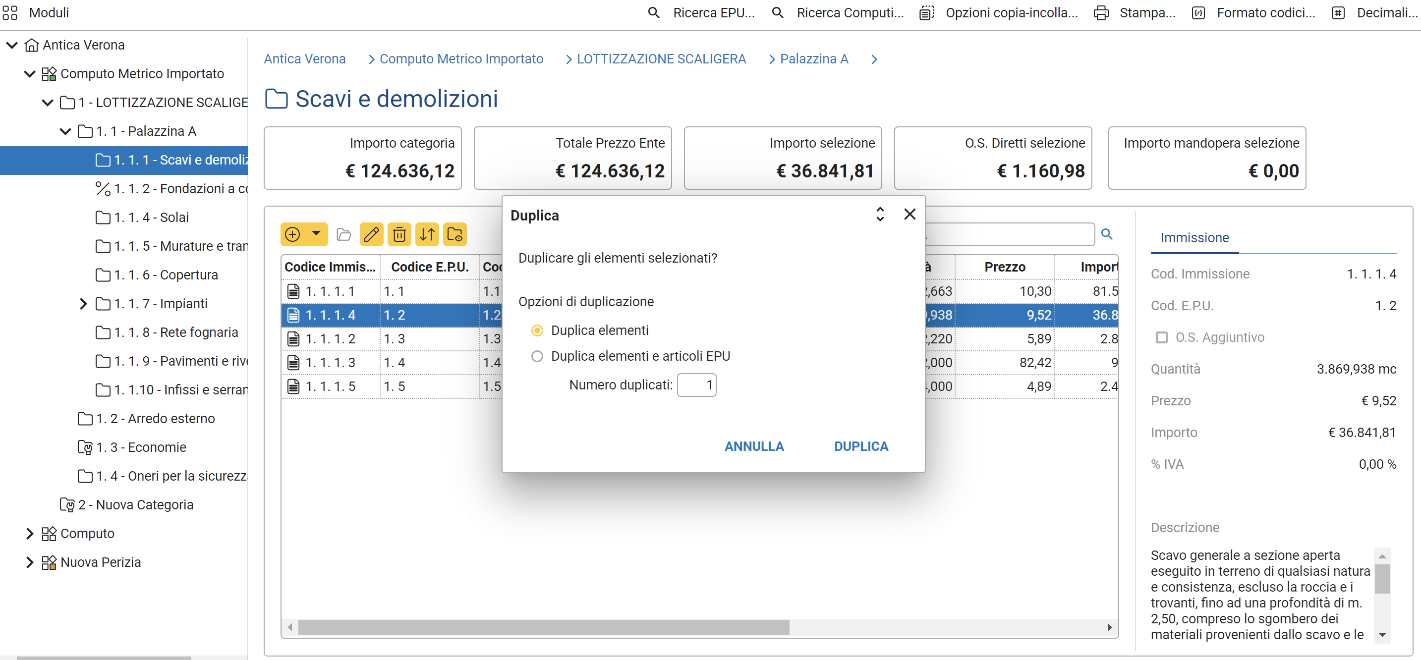 Oltre la normale duplicazione degli elementi, è possibile utilizzare la funzione Duplica N volte. Tale funzione è presente nel menù contestuale (tasto destro del mouse) sia per le categorie del computo sia per le singole immissioni. Nel "Duplica" apparirà inoltre una finestra nella quale chiede quante volte duplicare l'elemento sezionato.