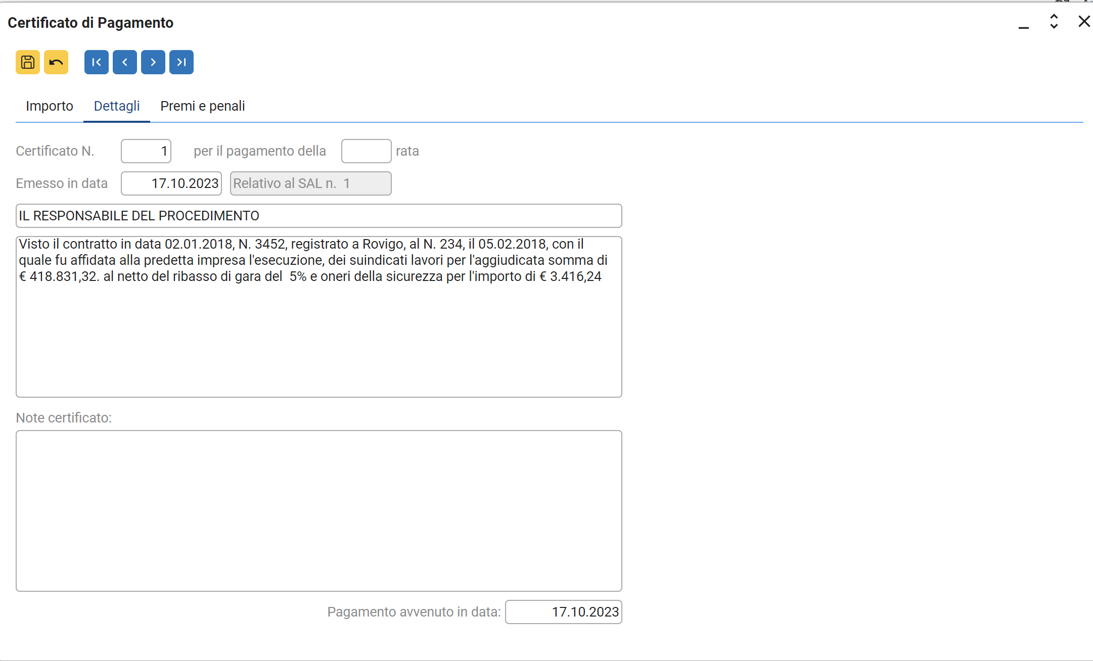 - Certificato N.: Numero progressivo del Certificato di Pagamento, calcolato dal sistema;