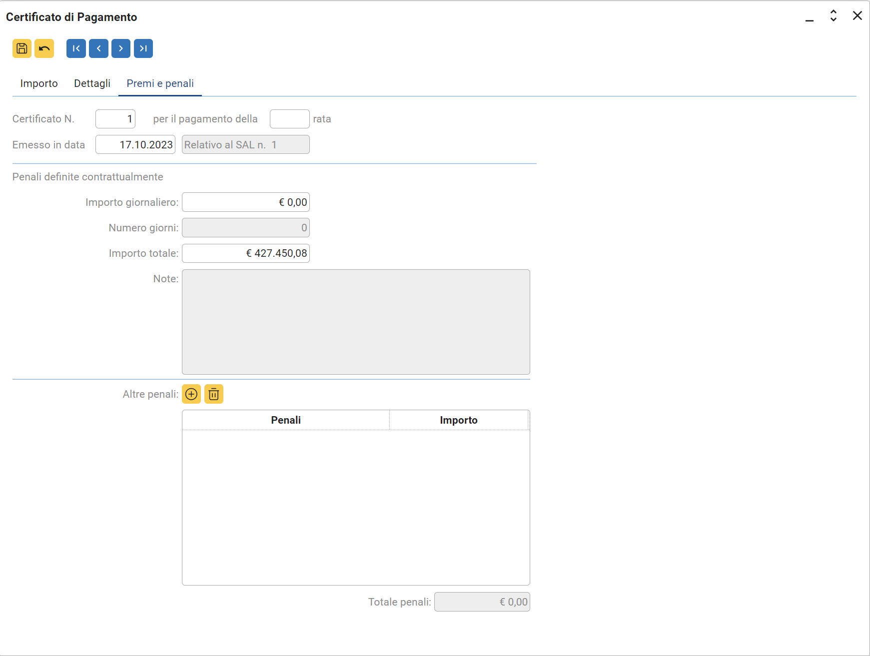 Mediante i pulsanti in giallo presenti nella ToolBar è possibile inserire una o più penali. Ogni penale è caratterizzata da una "descrizione" e da un campo "importo". La somma delle penali apparirà nella scheda "Importi" .