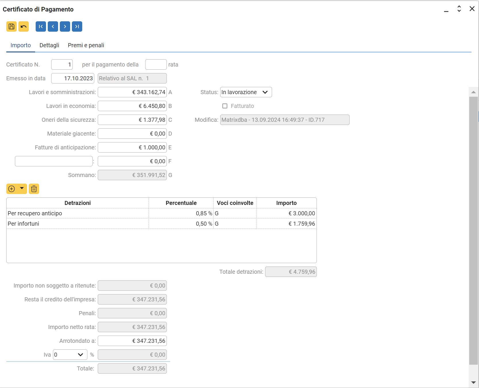 Sarà possibile modificare a piacimento gli importi della sezione "Sommano". All'interno della sezione delle detrazioni 8BIM Platform - Preventivazione e Contabilità inserisce una serie di detrazioni standard, ma l'utente può liberamente modificarle o inserirne di nuove. Impostare eventualmente un arrotondamento di importo, selezionare la % di IVA e salvare il Certificato.