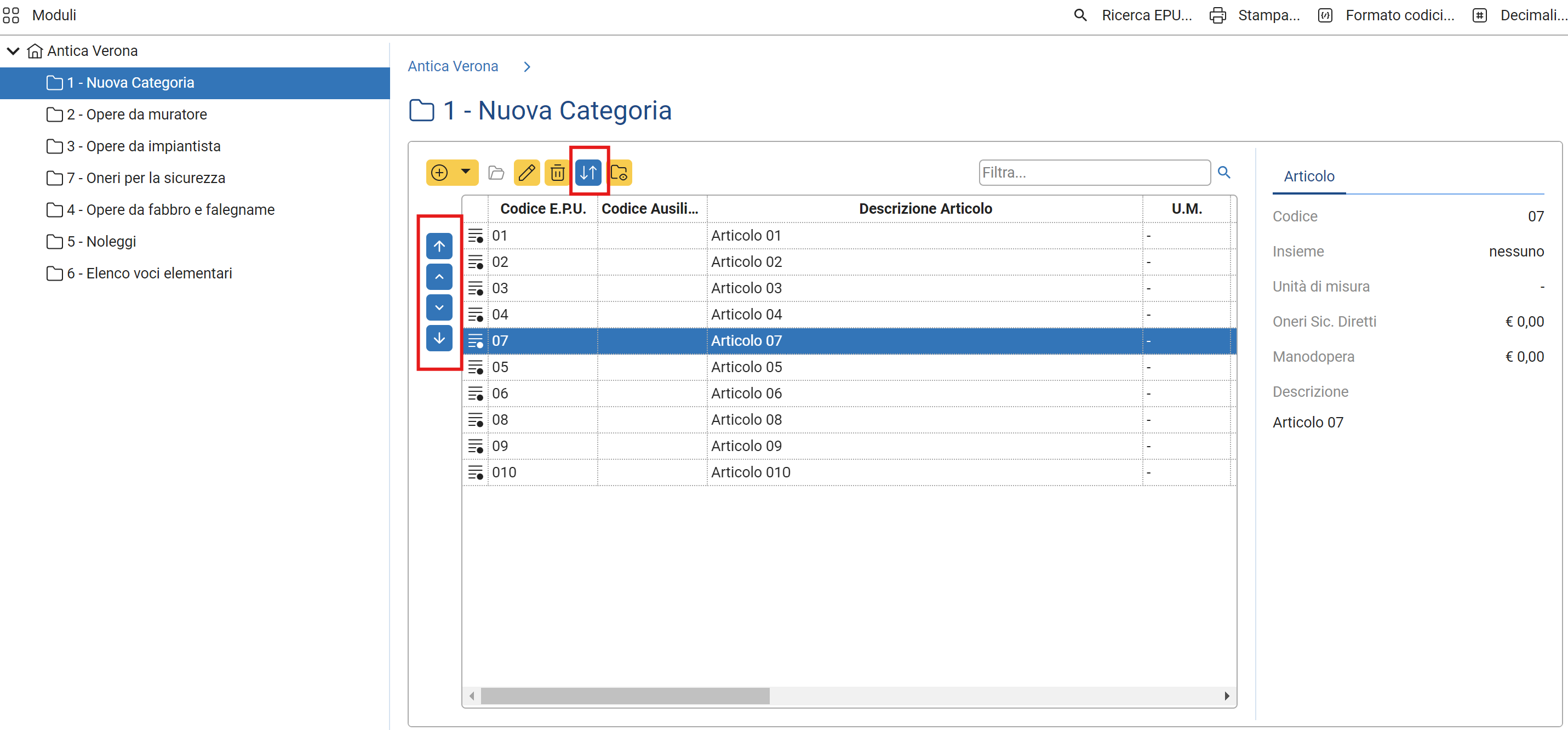 Ipotizziamo che all'interno di una categoria di EPU vi siano dieci articoli con rispettivo codice EPU da 01 a 010. Ora supponiamo di spostare l'articolo con codice EPU 07 tra gli articoli con codice EPU 04 e 05 con la funzione "Riordina", la quale attiverà dei pulsanti come fa figura: