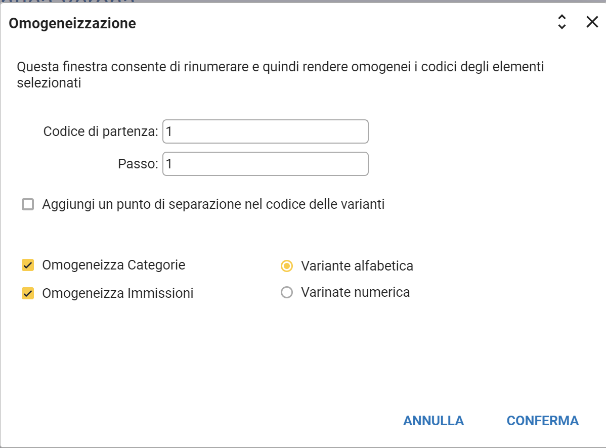 - A questo punto comparirà una finestra che permetterà di scegliere i criteri con i quali omogeneizzare gli elementi selezionati (vedi figura);