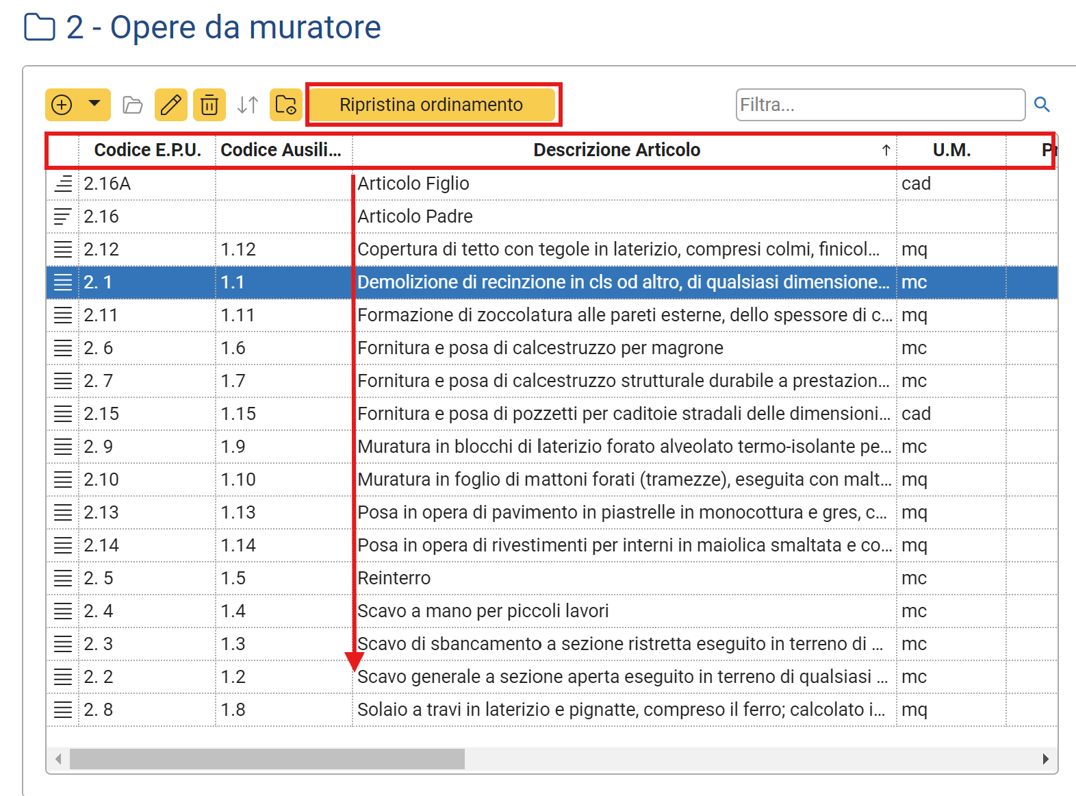 In questo modo 8BIM Platform - Preventivazione e Contabilità darà la possibilità di ripristinare l'ordinamento originale senza apportare alcuna modifica (nell'immagine sottostante è stato ipotizzato un ordinamento per descrizione).