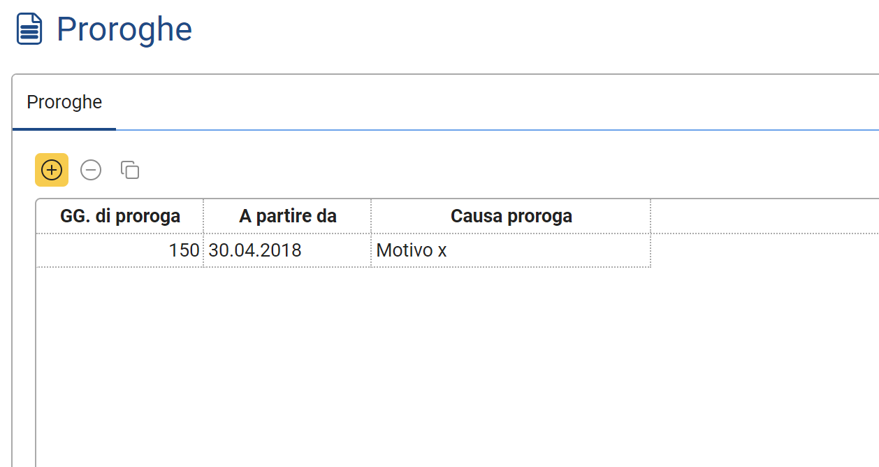 Per la creazione, modifica o eliminazione delle righe di proroga è necessario utilizzare la ToolBar in alto a sinistra.