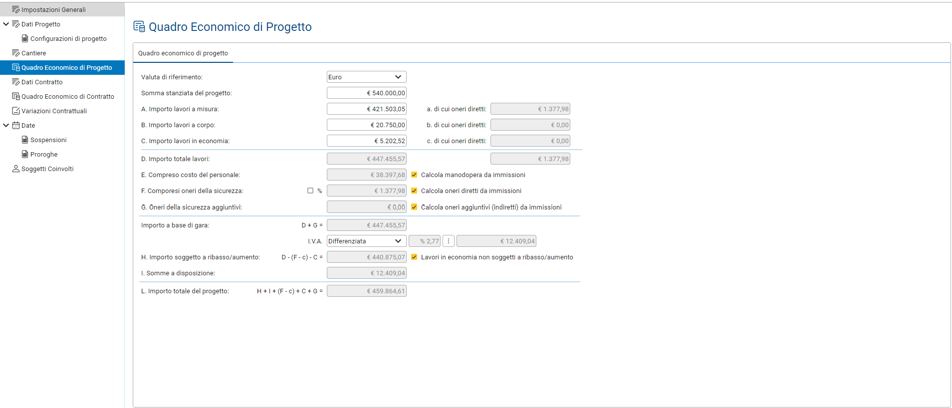 - Importo totale del progetto (L): Questo campo, pur rimanendo modificabile da parte dell'utente, viene calcolato automaticamente dal programma.