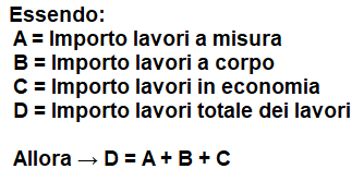 - Importo totale dei lavori (D): Questo campo può essere compilato direttamente dall'utente, ma nel caso sia stato compilato anche solo uno dei tre campi precedenti, viene calcolato automaticamente dal programma come segue: