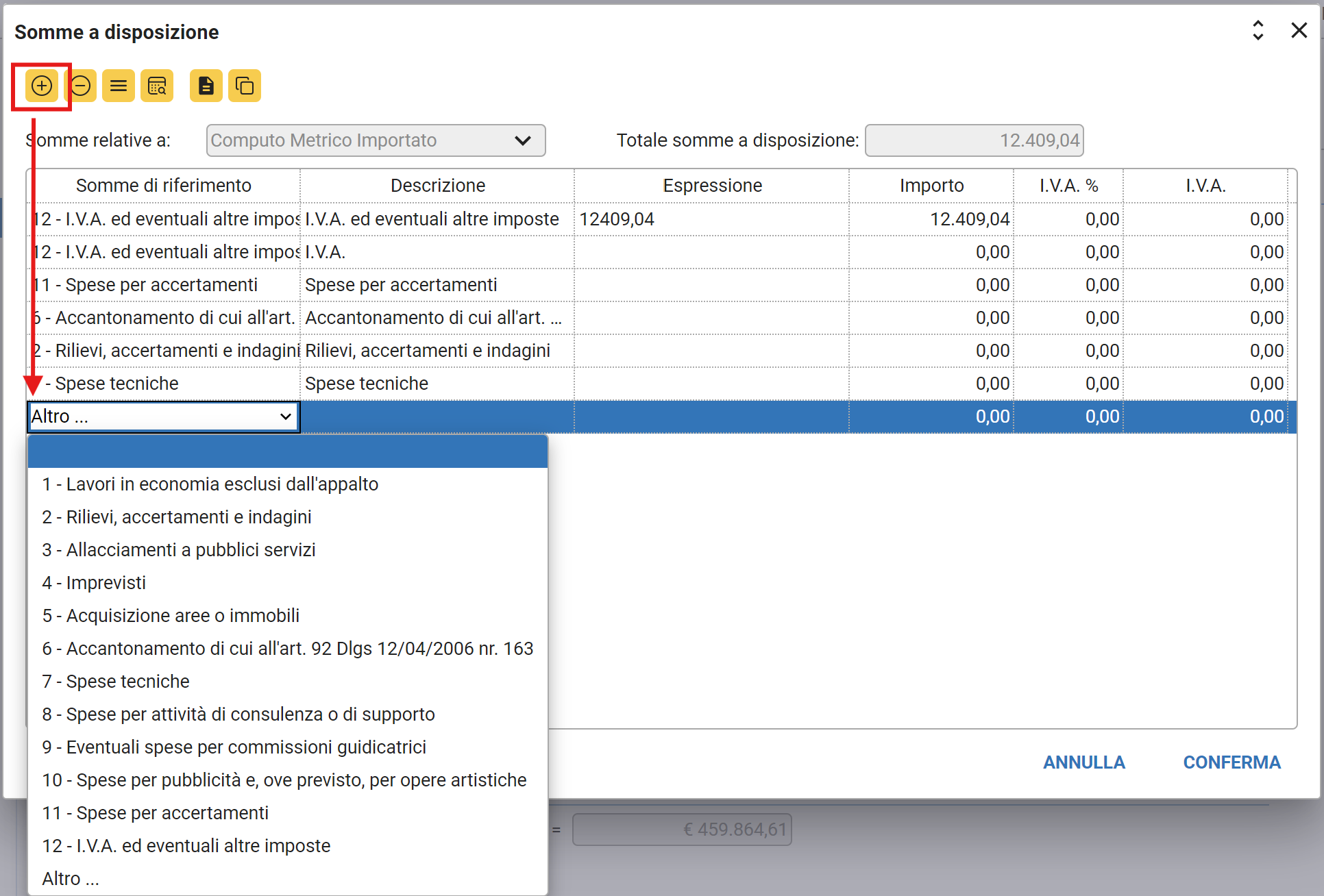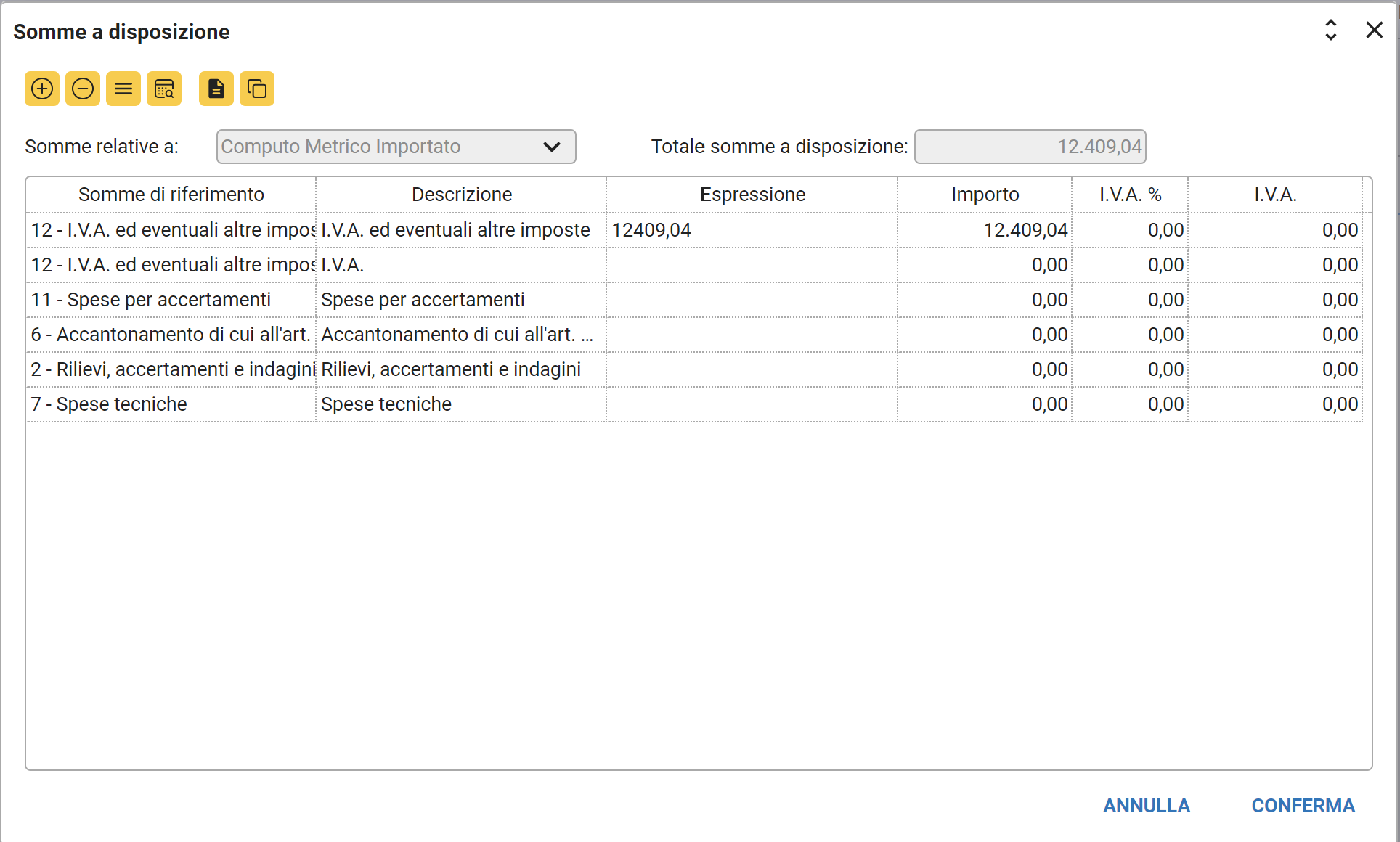 Per poter inserire una nuova riga in Somme a Disposizione è necessario operare con l'ausilio della ToolBar in alto a sinistra: