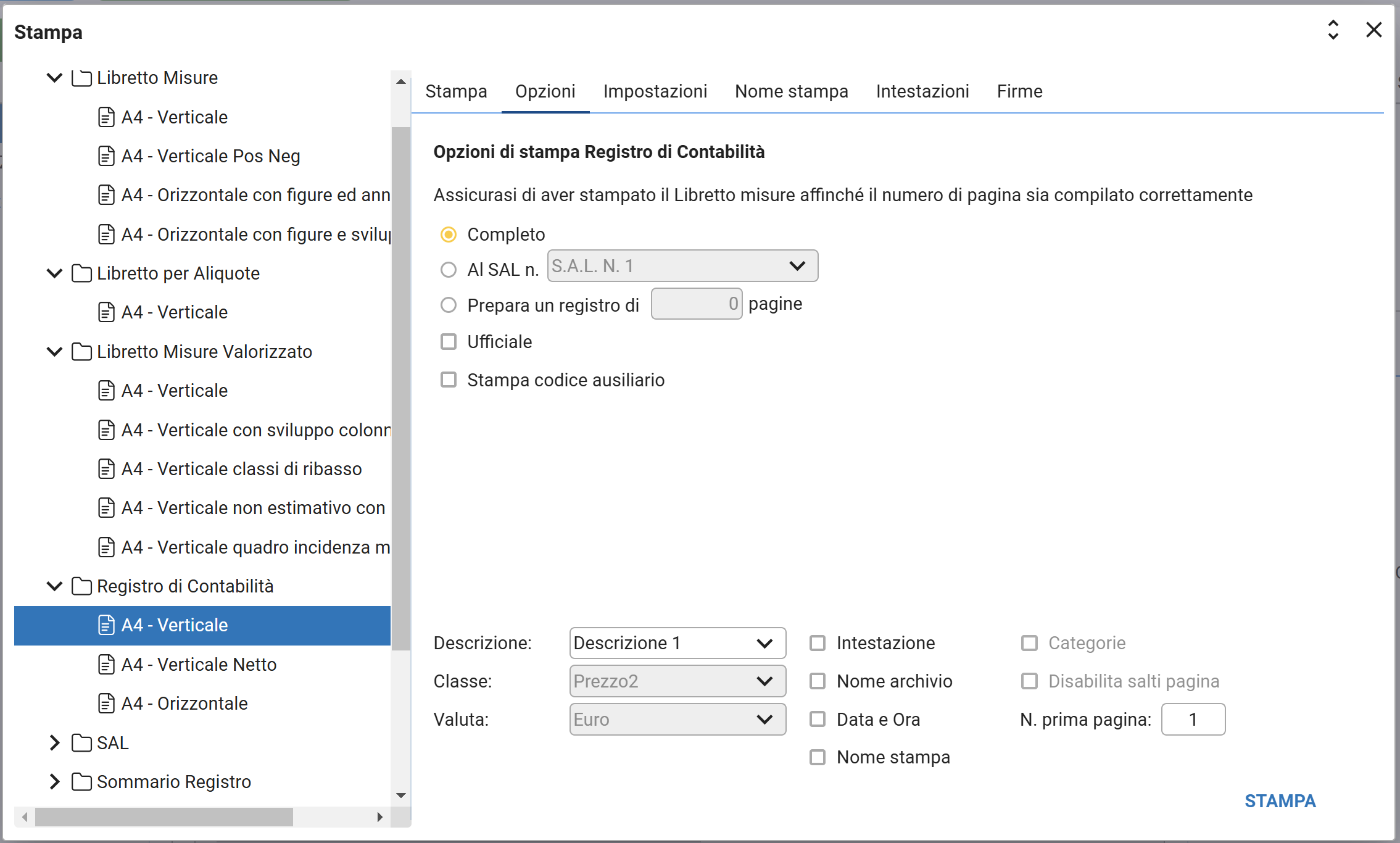 Seleziona immissioni: Questa opzione permette di stampare un registro completo, con immissioni riguardanti fino ad un sal selezionato oppure fino ad un numero di pagine specifico;