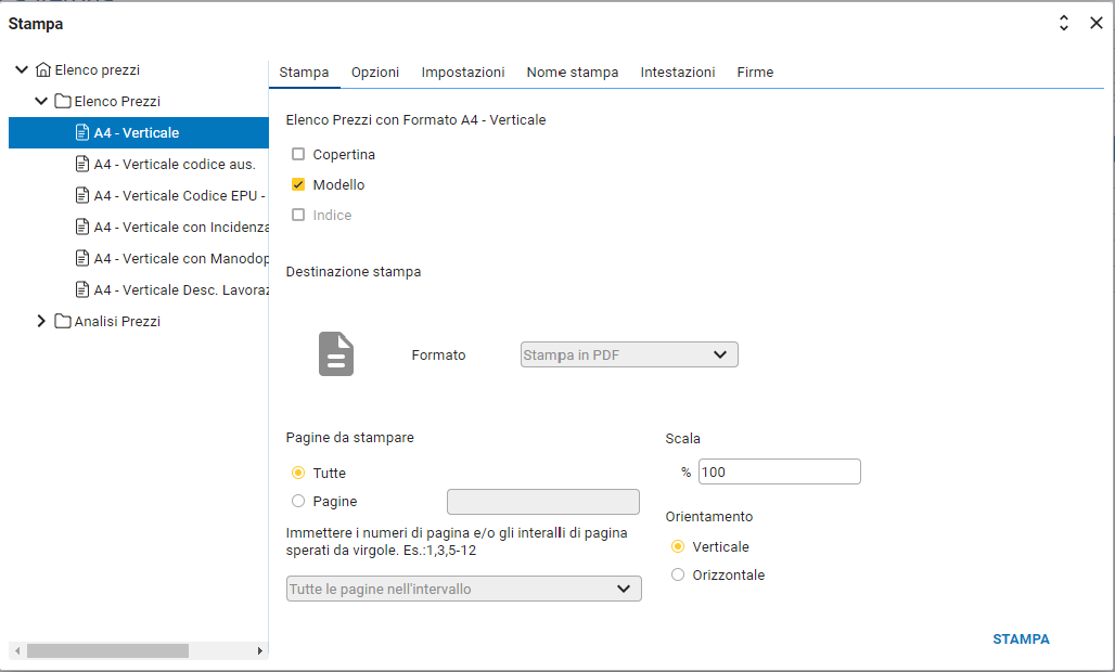 La scheda "Stampa" permette di scegliere cosa stampare: se solo la copertina, il corpo della stampa (modello), l'indice o una combinazione tra queste. Abbiamo la possibilità di impostare il numero di stampe da effettuare ed il formato.