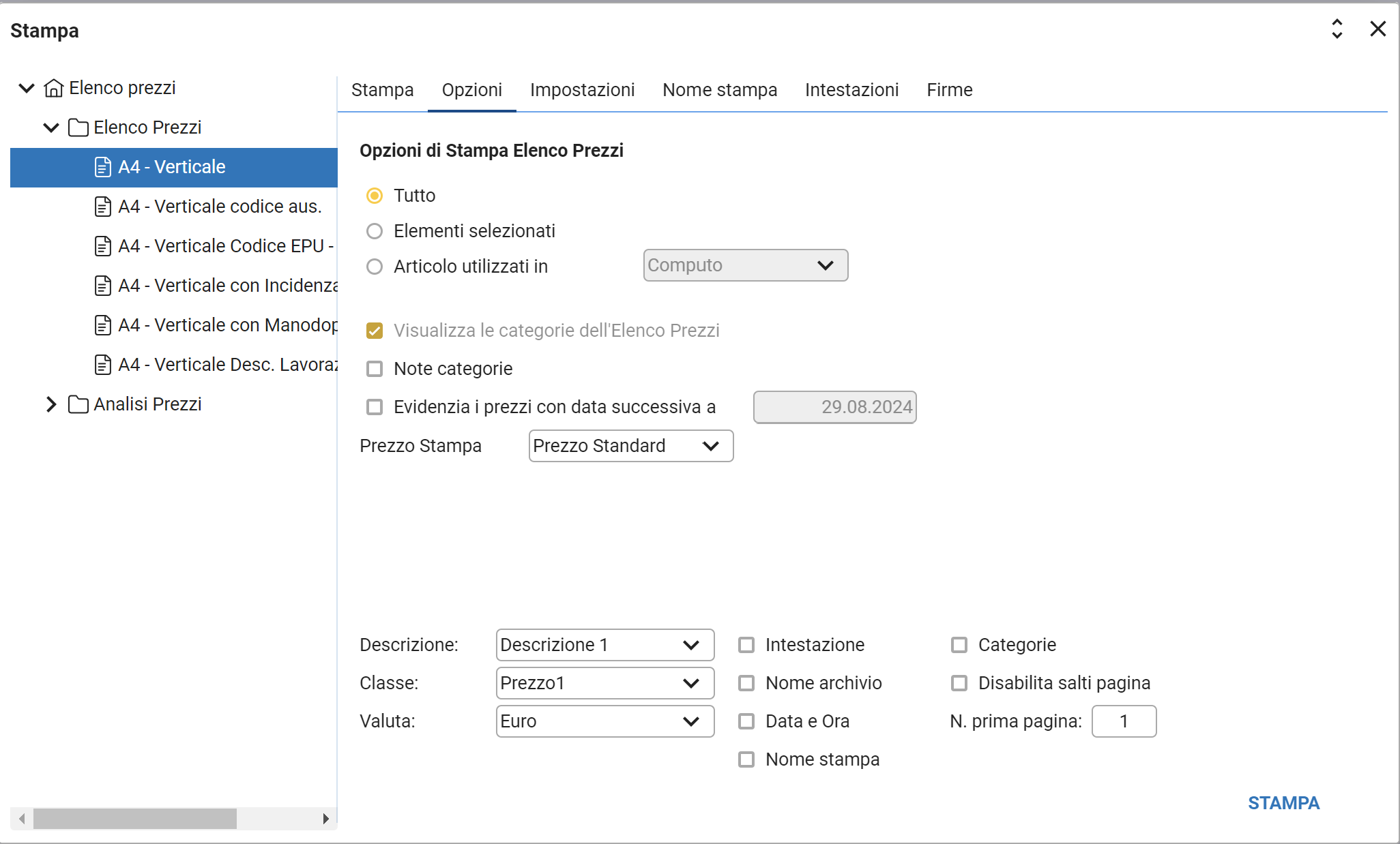 La scheda "Opzioni" contiene impostazioni diverse per ogni tipologia di stampa (nel caso specifico è rappresentata la stampa di Elenco Prezzi):