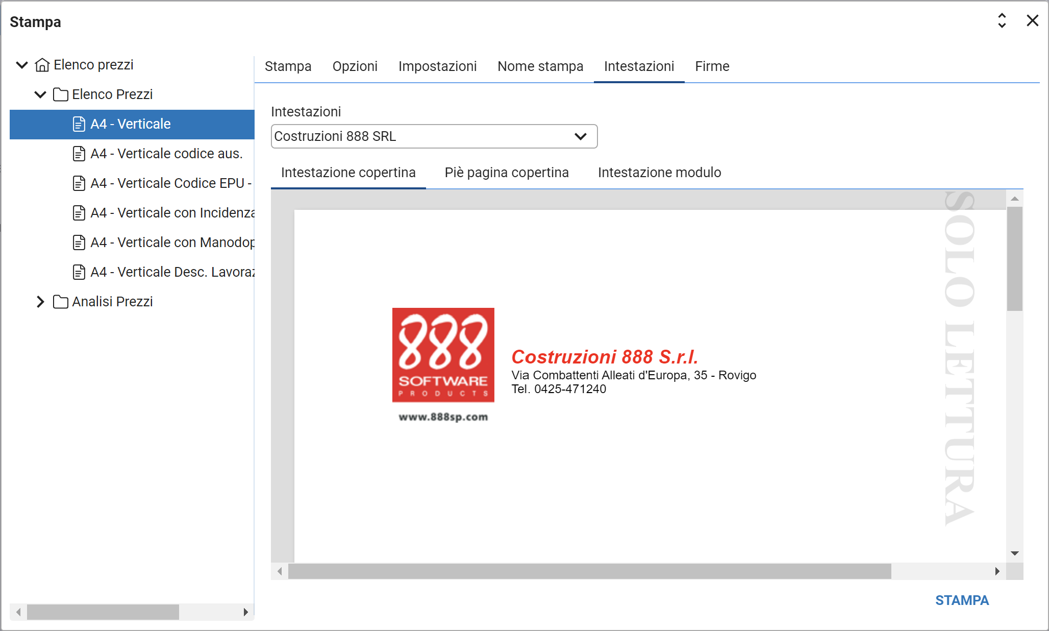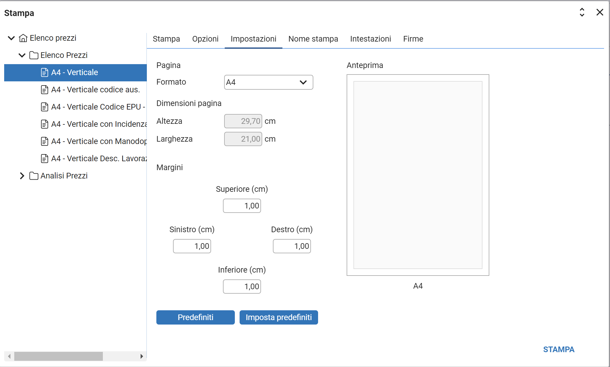 - L'area a sinistra ci mostra tutte le stampe utilizzabili nel modulo selezionato. Le stampe a sua volta sono suddivise in cartelle che condividono la tipologia della stampa ma sopratutto le opzioni di stampa;