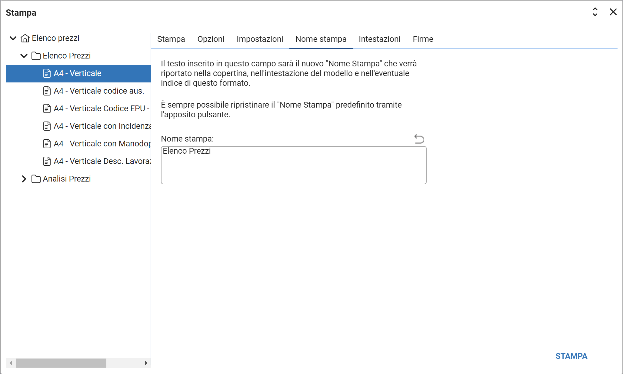 Nella scheda "Nome Stampa" abbiamo la possibilità di personalizzare il titolo della stampa che appare in copertina: