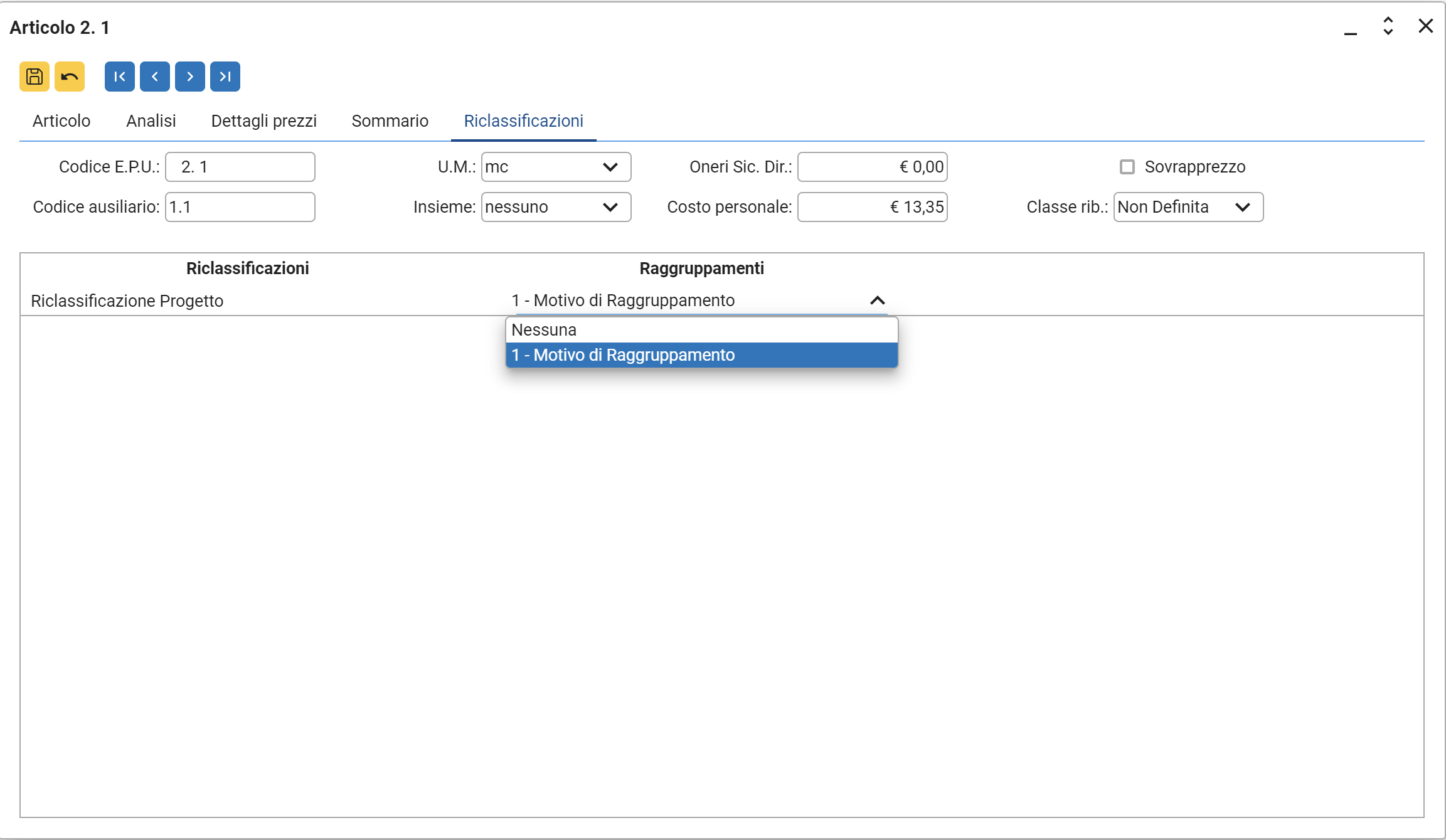 Il modulo si trova in Preventivazione - Riclassificazioni e comparirà nella scheda dell'articolo nel pannello Riclassificazioni dopo aver creato la riclassificazione ed il relativo raggruppamento.