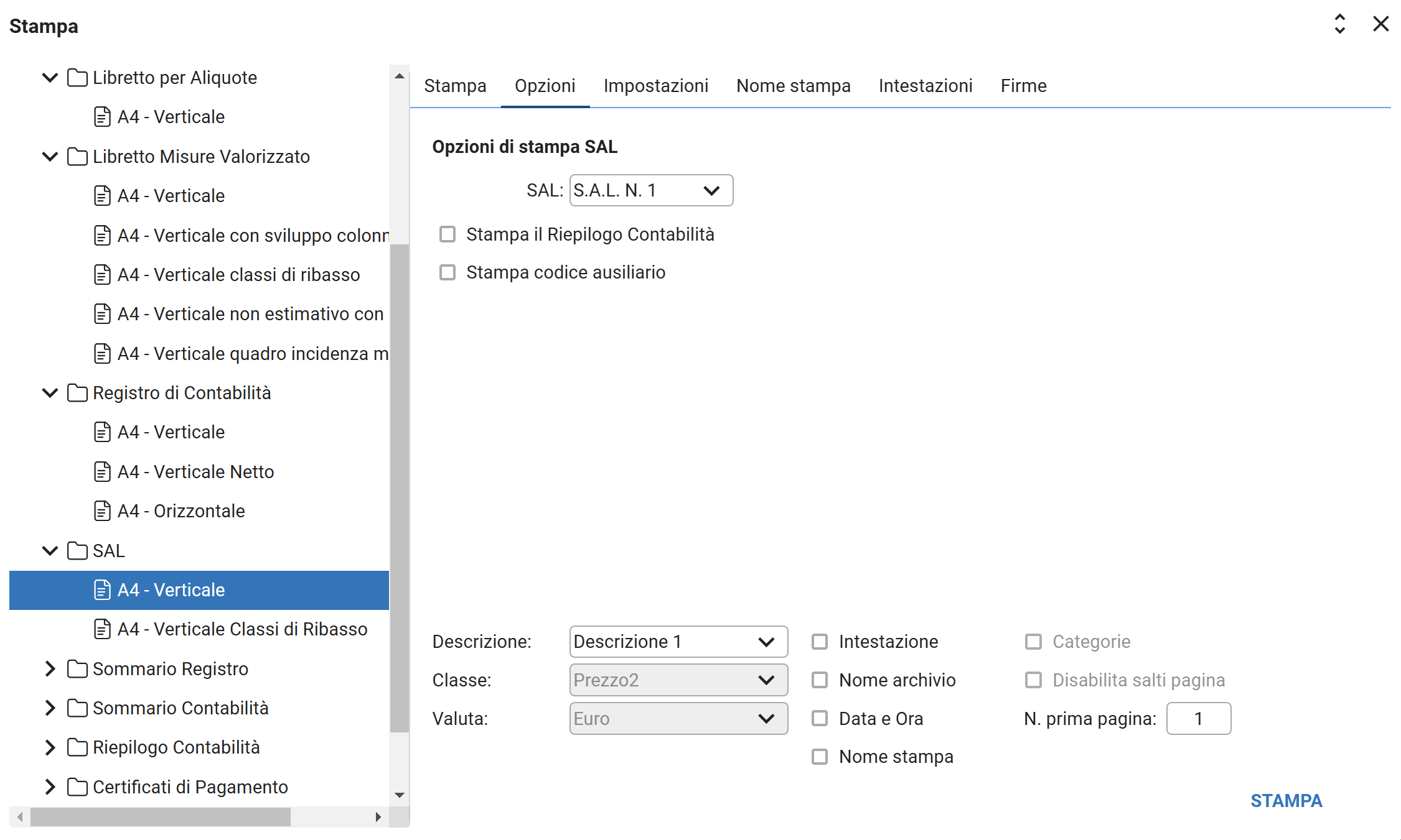 Guida UtenteContabilitàStampe Contabilità SAL SAL: Questo menù a discesa permette di selezionare quale SAL stampare; Stampa Riepilogo Contabilità : Se abilitato, questo flag permette di stampare il riepilogo della contabilità subito dopo il SAL.