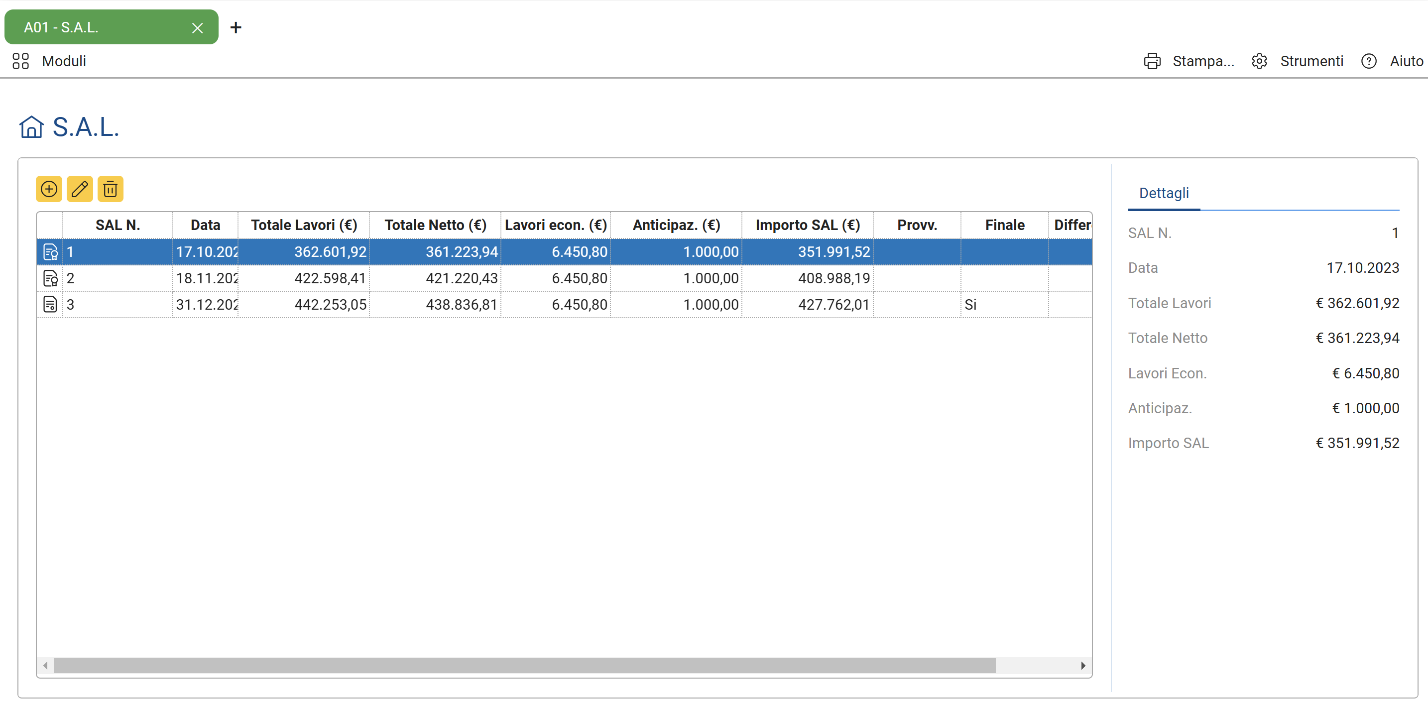 Quando l'importo dei lavori raggiunge l'ammontare della rata d'acconto prevista nel capitolato si può procedere con l'emissione dello Stato di Avanzamento Lavori (SAL). Il SAL rappresenta quindi una visione progressiva dell'avanzamento lavori di un cantiere ad una specifica data. Di conseguenza, il SAL 4 di un lavoro conterrà tutte le lavorazione eseguite fino alla data del SAL 4.