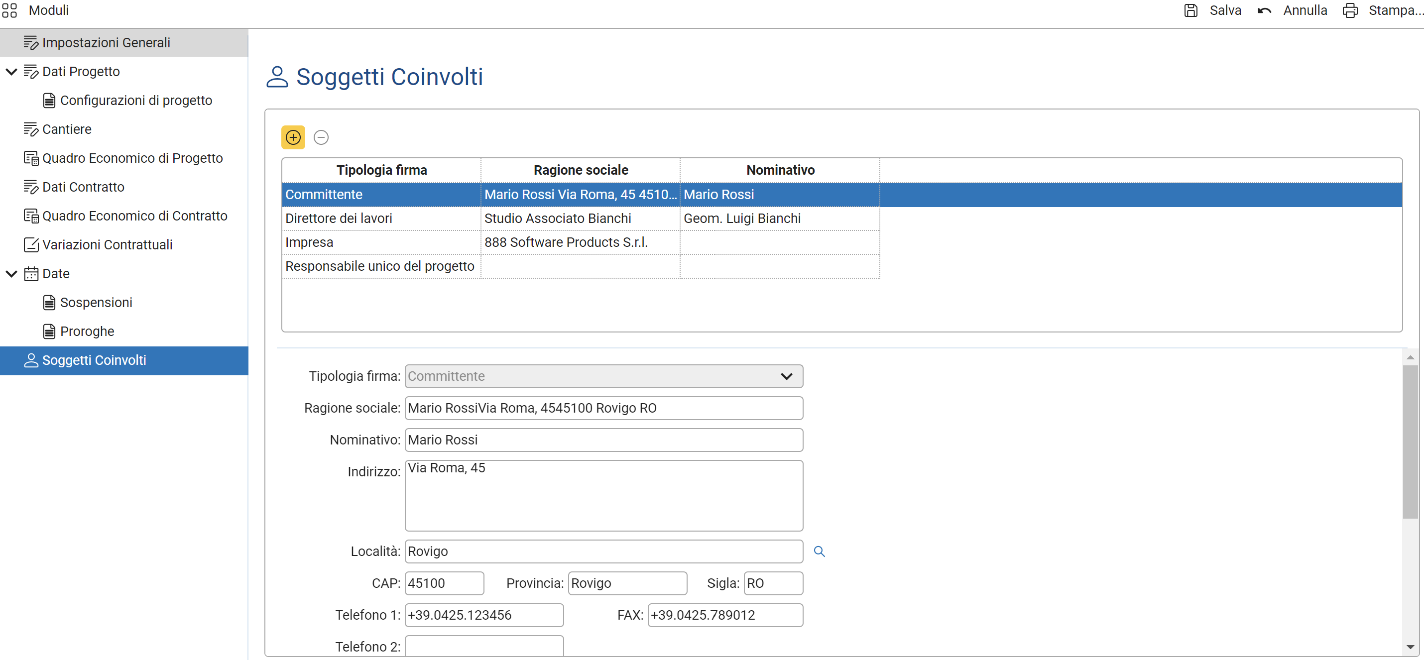 ATTENZIONE: I Soggetti Coinvolti permettono di gestire, a livello centralizzato, anche le firme da utilizzare nelle stampe dei report. |
