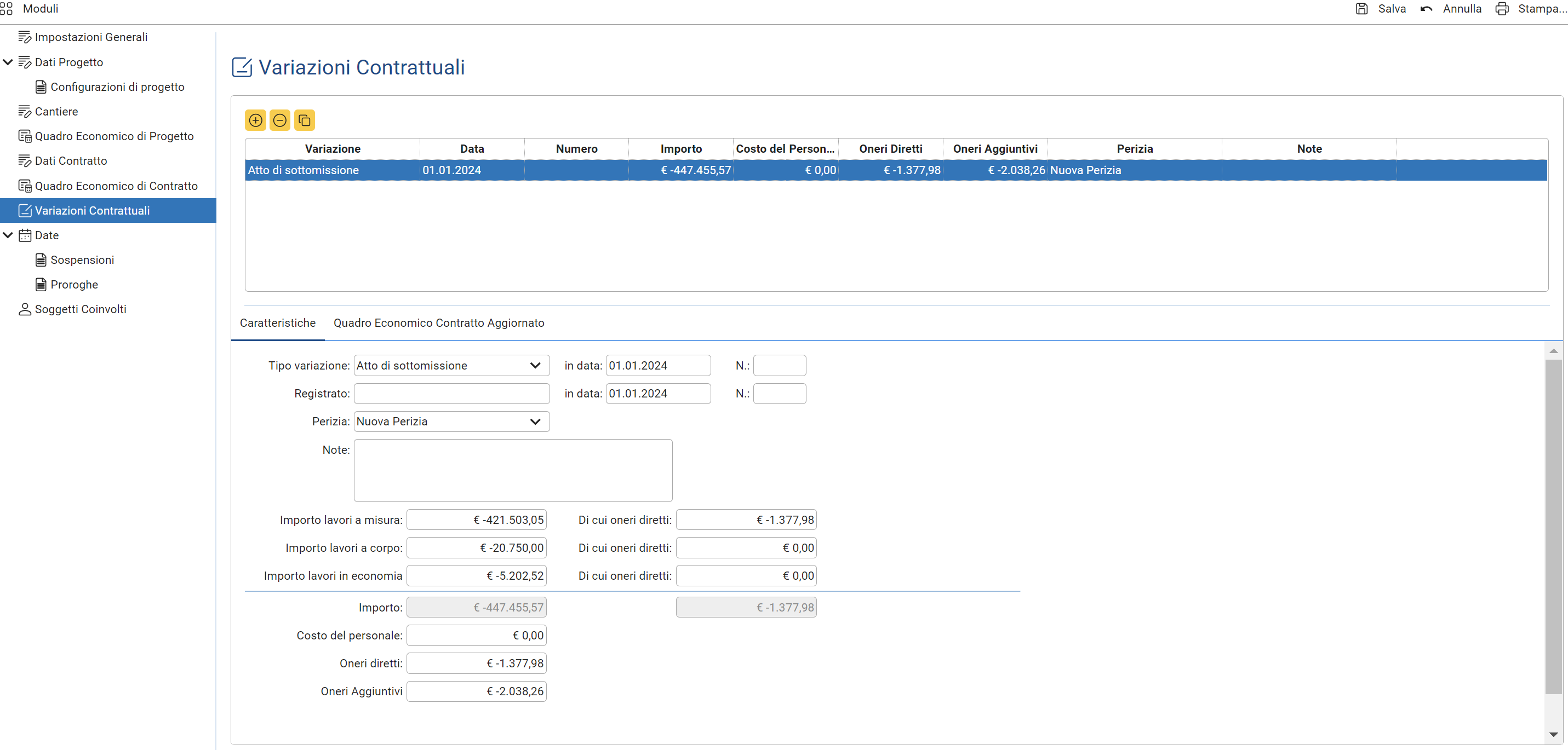 Questa scheda è costituita da dati compilati con le informazioni della Variazione Contrattuale e campi importo riportanti la differenza tra importi della Variazione e importi del precedente QEC.